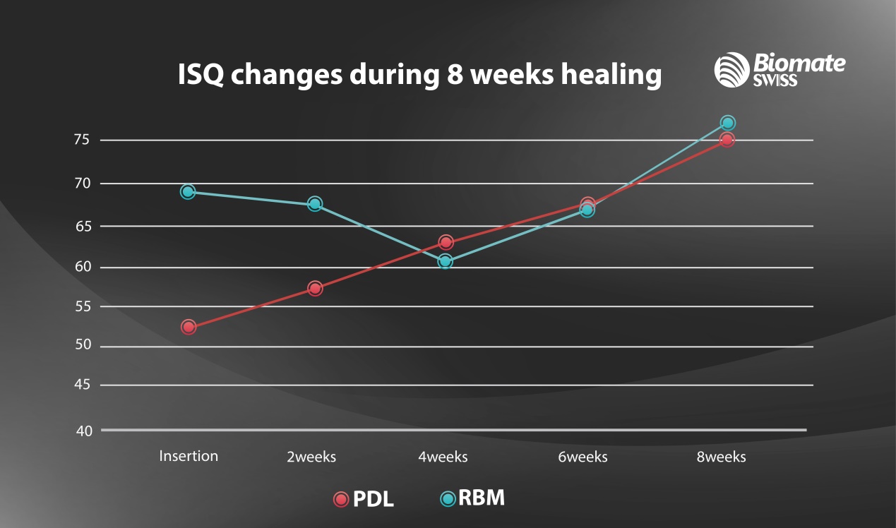 植牙手術後通常會進入最不穩定時期,植牙很容易在這時期失敗,由DR. AMR HOSNY ELKHADEM教授醫學研究8週植牙初期穩定度比較證實,百瑞仕植體的PDL®技術在植牙手術初期, 非但沒有不穩定,穩定度持續提高。