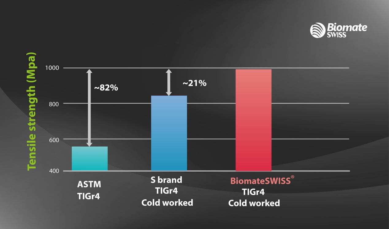 鈦金屬比鋼堅硬三倍以上,具有重量輕、抗腐蝕能力強等特性;常見用於各式醫療器材中;並且純鈦的生物相容性高,穩定性佳並耐磨、耐腐蝕,故一般市面上多使用「鈦」作為主要植體材質。BiomateSWISS百瑞仕的植體,同樣也選用,醫療純鈦材質製成;並利用PDL®雷射表面處理專利、及「四級鈦冷鍛技術」,創造出998 Mpa超耐韌強度。