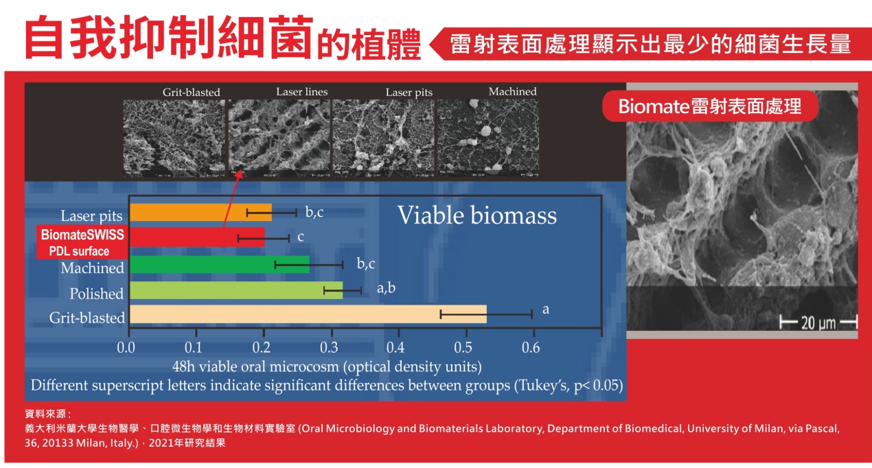 在義大利米蘭教授研究比較中證實:在顯微鏡顯示下,PDL®雷射表面處理專利的BiomateSWISS百瑞仕植體,表面與其他品牌的植體相較,擁有最少的的細菌生長量。